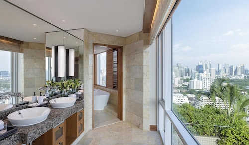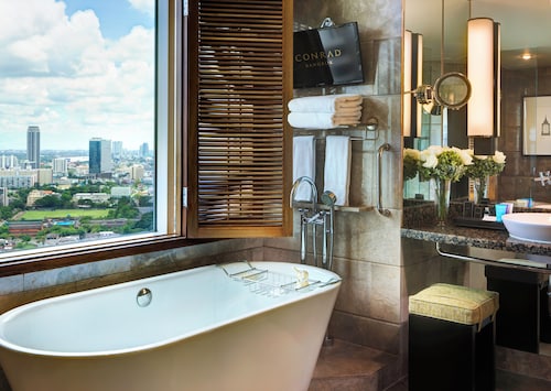 最高峰・コンラッドブランドの一流サービスがお手頃に楽しめる。 BTSチットロム駅まで徒歩10分。バンコク最大級のルンピ二―公園も徒歩圏内。 繁華街で賑わうスクンビットエリアに行くなら電車で2駅のアソーク駅へ。 もう一つの繁華街シーロム地区へも車で15分という便利なロケーション。 エントランスではドアボーイスタッフが笑顔ときびきびとした動きで迎えてくれます。 フロントのスタッフも丁寧、かつ無駄な動きのない対応でスムーズにチェックイン。 客室はスタジオタイプのお部屋でも、スーツケースを2つ広げてもまだ余裕のあるゆったりとした広さ。 入った瞬間に眠りにつけそうなふかふかなベッド、ベッドルームが完全に覗けるセクシーバスルームなど、 斬新で高級感もたっぷり。アメニティは石鹸、シャンプー、歯ブラシなど完備しており充実しています。 アメリカ、イギリス、日本、スイスの大使館も近いせいか、館内は常に エグゼクティブな客層でにぎわっています。 ホテル内にある中華や和食レストラン、イタリアンは接待でも十分使える一流レストランばかり。 広々としたロビーラウンジでは時間によって生バンドがあるので、 1日の終わりに音楽を聴きながら1杯いかがでしょうか。 ヒルトンチェーンなので観光はもちろんのこと、ビジネスとしても贅沢に利用したい一流ホテル。 スタッフの教育、お部屋の充実、ロケーションはもちろんのこと、コンラッドブランドが 1部屋25,000円ほどで泊まれるのだから、絶対に宿泊の価値あり!!!