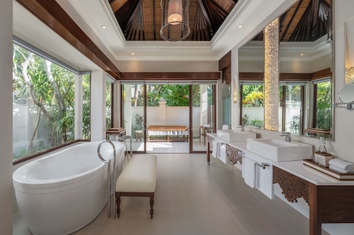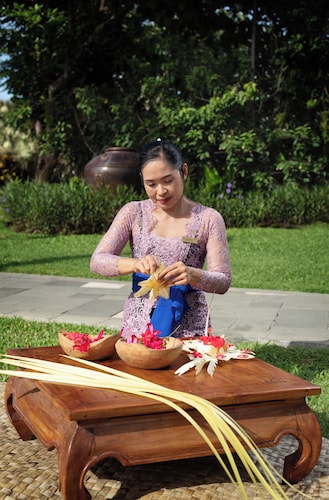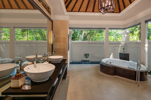 今やバリではラグーンアクセスルームを有するホテルはいくつかありますが、ここ「ラグーナ」がバリでのラグーンアクセスの老舗。ビルディングをぐるりと囲むようにラグーンが配され、数多くいるリピーターのお客様は、それぞれお気に入りの場所があるとか。客室数は300室弱でそう多くありませんが、ゆったりとした雰囲気が魅力。ヌサドゥア観光特区にあり、クタ等の繁華街からは遠いですが、ヌサドゥア内唯一のショッピングセンター、バリコレクションの隣にあり便利。ヌサドゥア観光特区内のホテルはビーチ沿いの遊歩道で繋がっており、近隣のホテルへのお散歩も楽しいかも。何といっても目玉はバルコニーからラグーンプールへ直接アクセスできる1階のラグーンアクセスルーム。お部屋の広さはスタンダードのデラックスルームと同じ36㎡とそんなに広くはありませんが、外から回らなくてもプールへ出られるのは魅力。近年、ヴィラも加わり、さらにグレードアップしました。バスルームは、バスタブとシャワーが一体型のお部屋も多いですが、バスタブがとっても大きくて優雅な気分に。もちろん、歯ブラシ、シャンプー、ドライヤーやバスローブなどのアメニティーも充実しています。また、1部屋