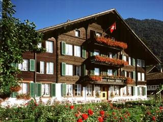 インターラーケンで数少ない、シャレースタイルと呼ばれる三角屋根、木造りのホテルです。3星中級クラスなので手ごろな料金で泊まれるのも魅力。場所はインターラーケン・ヴェスト(西駅)から徒歩7~8分、ウンターゼーンと呼ばれる地区にあります。