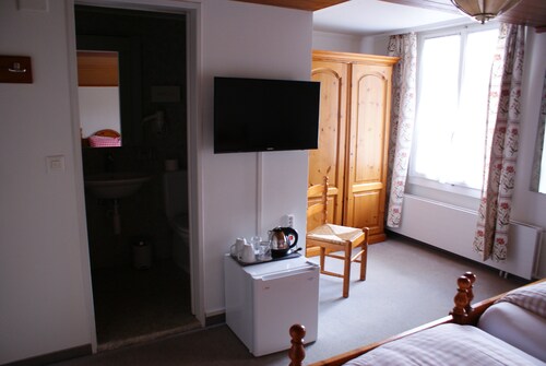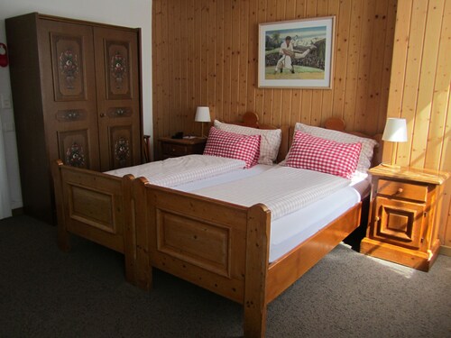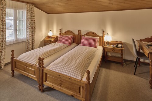 インターラーケンの隣村、ヴィルダースヴィルにある3星クラスのホテルです。場所はヴィルダースヴィルの村の中心。ヴィルダースヴィルの駅から400mの距離です。シャレースタイルと呼ばれる三角屋根、木造りのホテルで、部屋数は全部で50室。木をふんだんに使ったお部屋の内装に、心休まることでしょう。名前の「ベーレン」はドイツ語で熊の意味で、熊がこのホテルのシンボルマークになっています。淡い黄色の外壁に、緑の窓枠がとてもよくマッチしています。世界中からの観光客で賑わうインターラーケンと比べ、ヴィルダースヴィルはまるで時が止まったかのような静かで落ち着いた村。駅からホテルまで、のどかな田舎風景の中の一本道を歩くと、いつもここに泊まることにして良かったと感じさせてくれます。お部屋はシングル、ダブル、トリプル、4人部屋と人数に合わせて利用が可能。中にはバルコニーからユングフラウを見ることができるお部屋もあります。「大型のホテルではなく、スイスらしい雰囲気のこじんまりしたホテルに泊まりたい。」「値段もなるべく押さえたい。」という人にはここをオススメします。