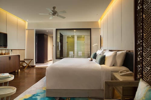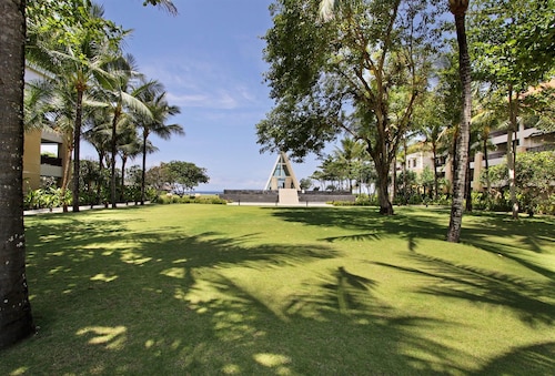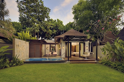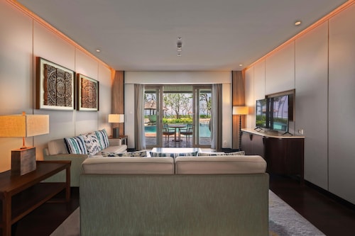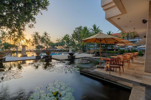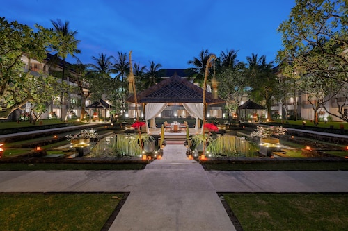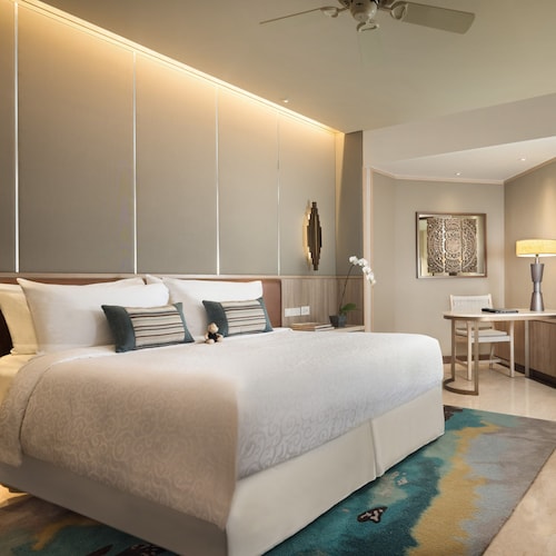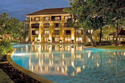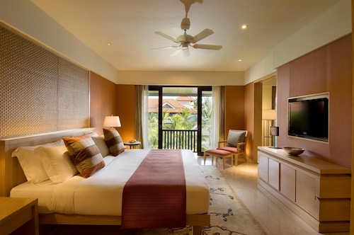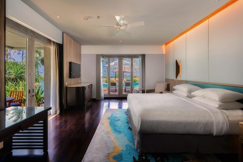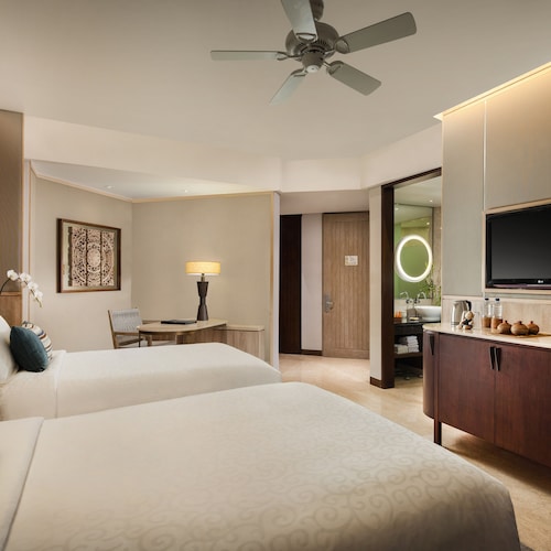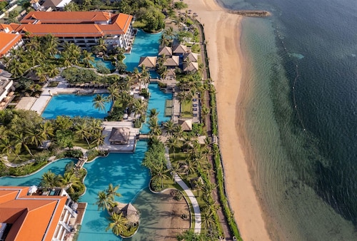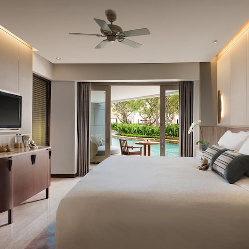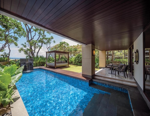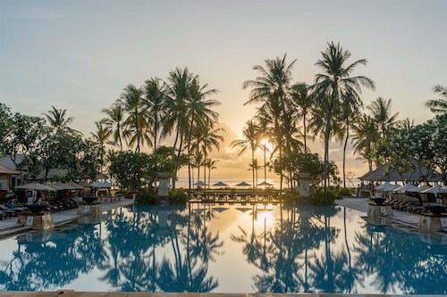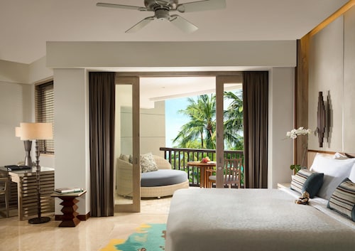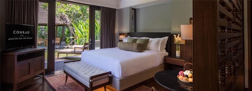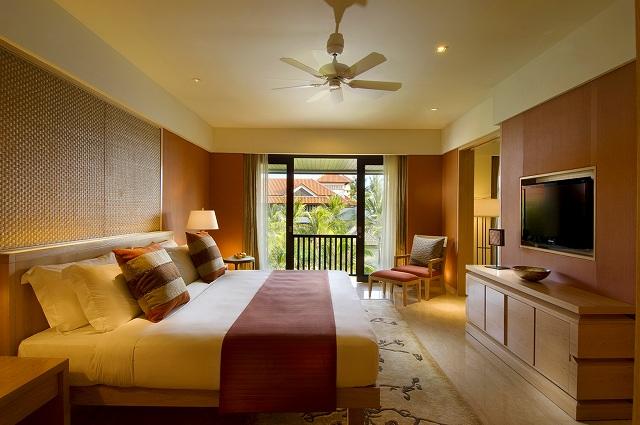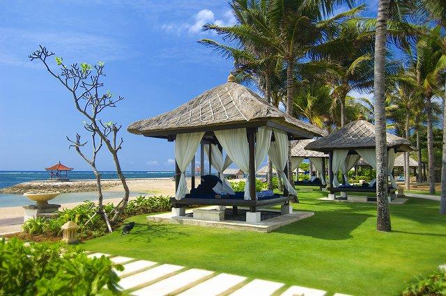 ヒルトングループの最高峰ブランドであるコンラッド。スタイリッシュなセンスが各所で光ります。まずロビーに入ると海からの風が吹き抜け美しい海を見渡すことが出来ます。メインプールやラグーンプールも最大級、お子様と一緒に存分遊ぶことが出来ます。大人のカップルにお勧めは、海辺に面して建っている東屋。好きな音楽を聴いたり、本を読んだり、とにかくダラダラ過ごすには最高の場所です。予約制なので早めにお申し込みを。個性的なレストランも4箇所あり人気のスパ、ウォータースポーツも充実しているので、大人も子供もシニアの方も楽しめるのが特徴です。敷地内にあるチャペルは人気のチャペルで宿泊もコンラッドでという方も多いのも納得です。海上高速道路を使えば、空港から約20分。ブノア地区にあり目の前が海の抜群のロケーション。ヌサドァウ・リゾート内まで車で約5分。周りにはコンビニ、地元商店、レストランがありますので便利です。大型ホテルが多いのでタクシーも簡単につかまります。白を基調とし清潔感あふれ、スタイリッシュなお部屋です。随所にバリっぽさも取り入れていてリゾートを感じさせてくれます。デラックスルームはガーデンビュー。デラックス・ラグーンは