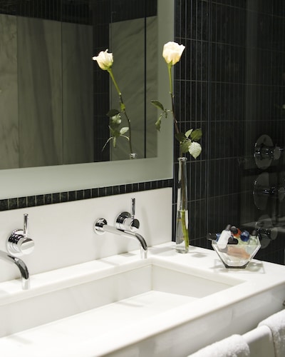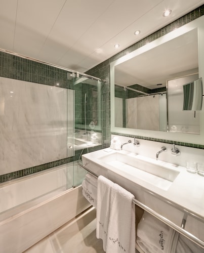 お風呂とトイレがドアで仕切られているバスルームのシンクは広く、大理石。アメニティはデルビーホテル・コレクションのボディミルク、シャンプー、シャワージェルが1セット、バスソルトがもう1つのセットになってプラスチックのポーチに入っています。コットンやシャワーキャップは、特製の箱に入って置かれているという繊細さ。