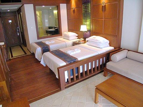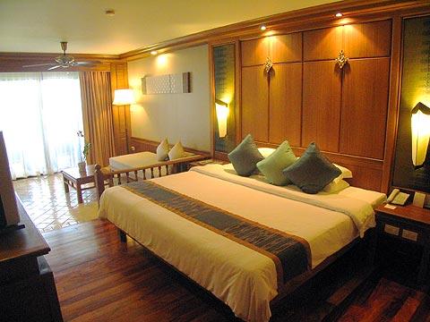 客室はフローリングや家具にチーク材をふんだんに使った、モダンタイスタイルの落ち着いたデザインのお部屋です。ビーチサイドには、ご家族でもゆったり泊れる広めのお部屋グランドスイート、ジュニアスイートがあり、バルコニーからはプール越しに海が望めます。一番リーズナブルなスーペリアはバスタブが無く、少々狭い印象。