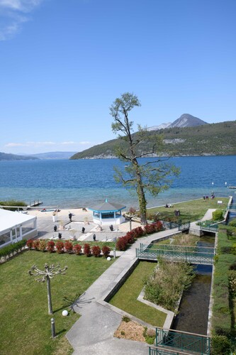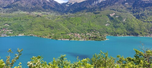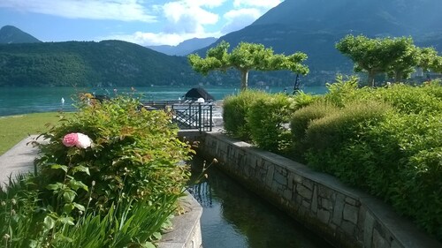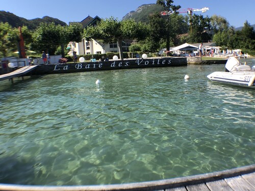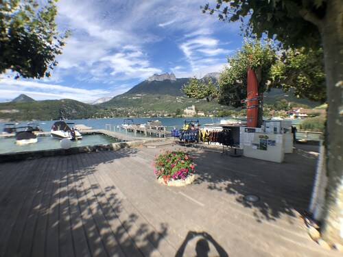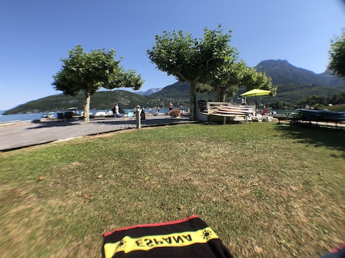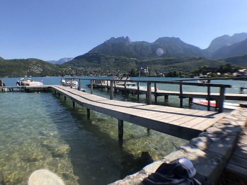 7. アヌシー湖、プライベートビーチ、ポンツーンのパノラマの景色を望む典型的な宿泊施設