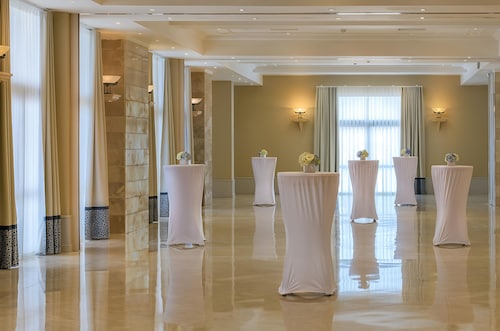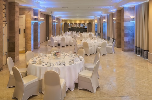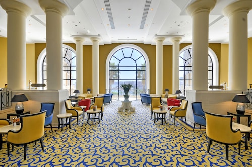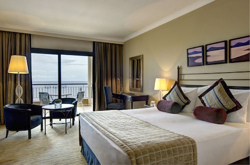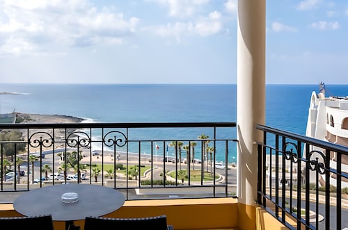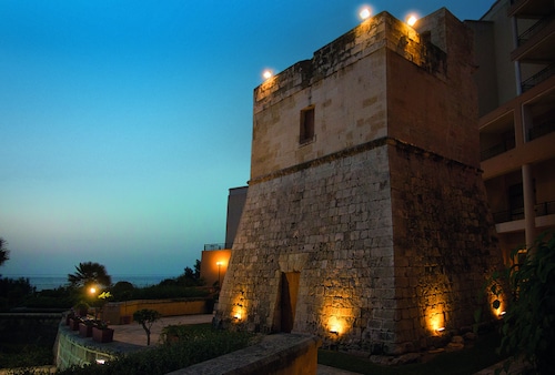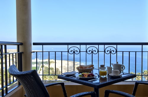 セントジュリアンズの繁華街パーチェヴィル地区の湾「セントジョージーズベイ」から延びる岬沿いにある、淡い黄色の外装が眩しい5つ星ホテルです。空港からの距離は8km。タクシーで約30分の場所にあります。立地としては、繁華街の騒がしさが湾で隔てられている為、静けさの中にも賑わいが見えるという状態が保たれています。ホテルからセントジョージーズベイの砂浜までは徒歩8分。浜周辺には、飲食店やナイトクラブが密集し、ショッピングセンターや映画館もあります。また、ホテルからは、スリーマ、バレッタへの無料定期往復シャトルも出ています。ホテル館内は、赤黄青の椅子が点在する賑やかなロビーを始め、全体的に明るい印象があります。屋外にはサボテンやハンモックが点在し、16世紀のタワー(見張り塔)も保存されています。館内及び敷地内には、5つのプール・岩場ビーチ・アーユルヴェーダや最新のトリートメントを提供するスパ・スポーツジム・ダイビングセンター・8つのレストラン等が併設されています。客室の大半は、海の見えるオーシャンビューです。部屋のスぺースはやや窮屈に感じましたが、バルコニーは広々として快適でした。設備・備品は5つ星ホテルに見合った