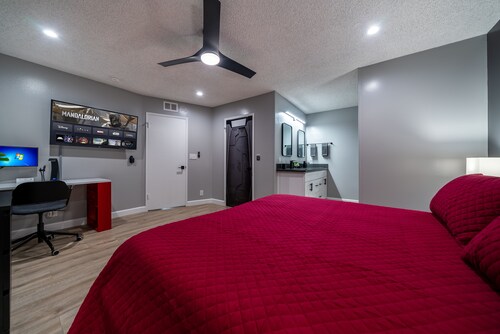 スタントンにあるファミリー向けのこのバケーションホームは、アドベンチャー シティおよびナッツ ベリー ファーム (テーマパーク)から 5 km 圏内です。ノッツ・ソークシティウォーターパークおよびブエナ パーク モールも 5 km 圏内です。 屋外プールのほか、この禁煙のバケーションホームにはホットタブおよびコンシェルジュ サービスがあります。その他の設備には、ランドリー設備、ゲームコーナー、および庭園があります。 バケーションホームには、ベッドルーム 4 室、WiFi (無料)、フェンス付きのプライベートヤードが備わっています。プライベートプールをご利用いただけるほか、冷蔵庫とオーブン付きのキッチンも備わっています。