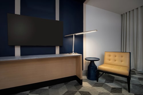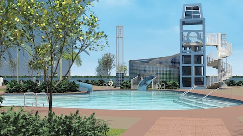 モノレールが建物内を通り抜ける、近代的な建物のデラックスリゾート