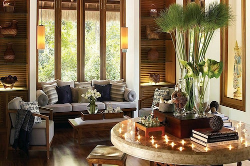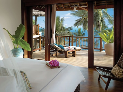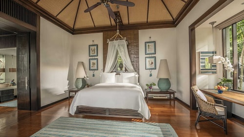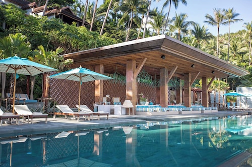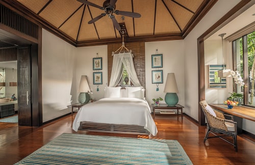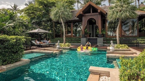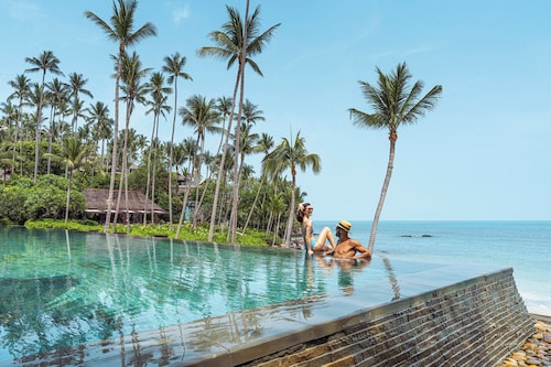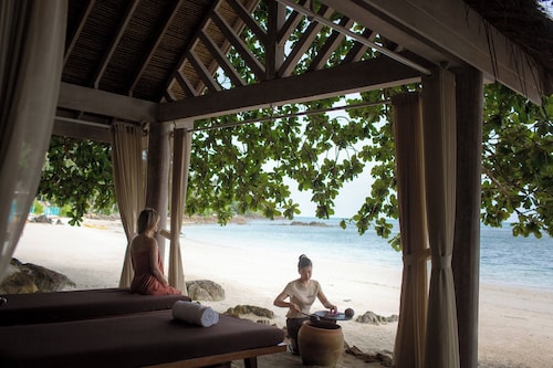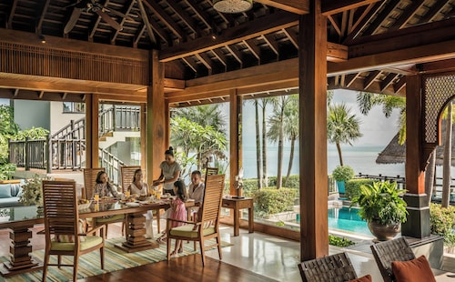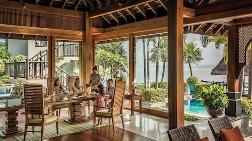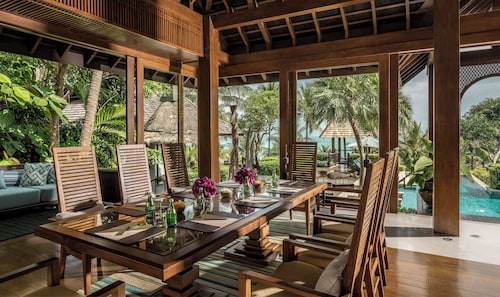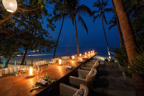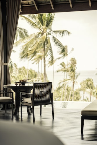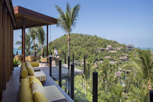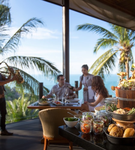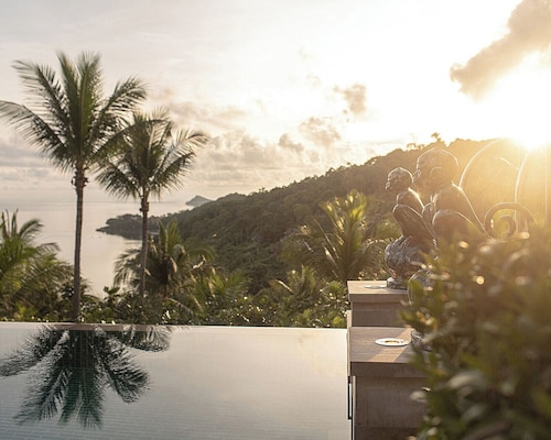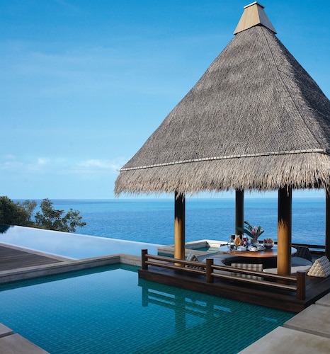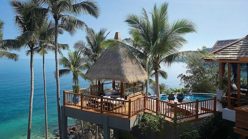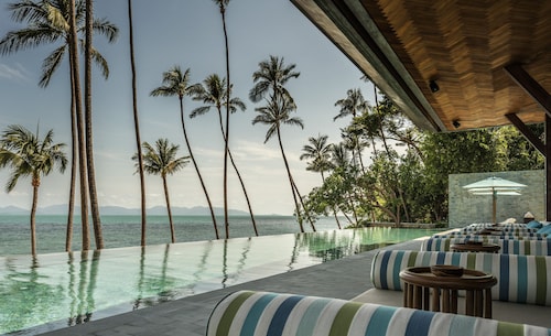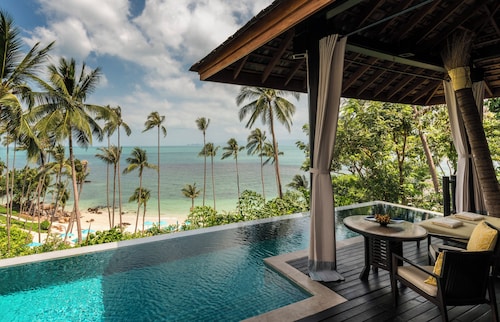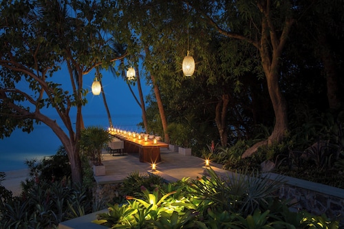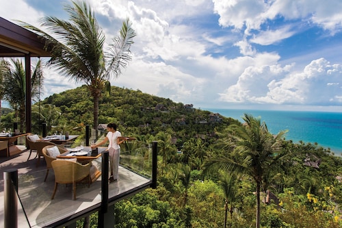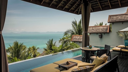 フォーシーズンズ コ サムイは、サムイ島の北西の角、レムヤイ岬の突端に建てられた、ラグジュアリーリゾート。小さなプライベートビーチを囲む斜面にヴィラタイプのお部屋が間隔をおいて建てられています。車留めの設置された大きな扉を通って、リゾート内に一歩足を踏み入れた瞬間、驚かされるのは、そのエントランスロビー。青い空とエメラルドグリーンの海、そして隣の島パンガン島を望む絶景をバックに、まるで空中に浮いているかのような、デッキスペースに2つのチェックインテーブルが配置されています。他のフォーシーズン系のリゾートがそうであるように、リゾートの中からは、リゾートの外の人工物は目に入らないように設計されていて、外の世界の喧騒から完全に切り離された、ホリデータイムを満喫することができます。客室は、全てのお部屋がプライベートプールを備えたヴィラタイプ。一番リーズナブルな1ベッドルームヴィラでも103 ㎥の広さ。ファミリーで利用できるファミリービラや、ハネムーナーに人気のビーチフロントヴィラなど、全6カテゴリーが用意され、どのお部屋からも、美しいシービューが楽しめます。飲食施設も充実していて、昼間はビーチサイドレストラン「P