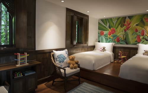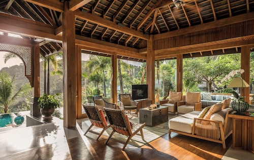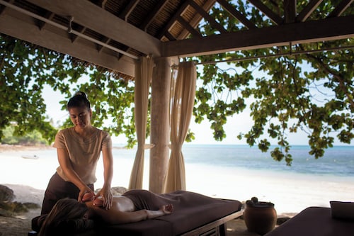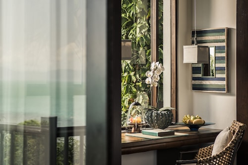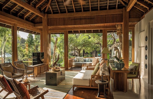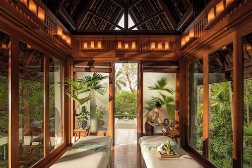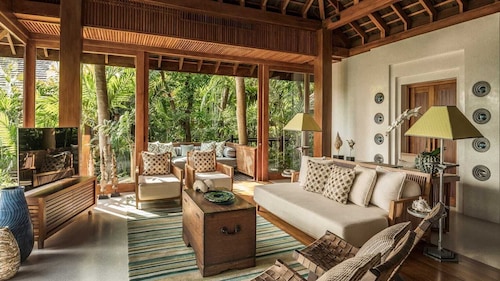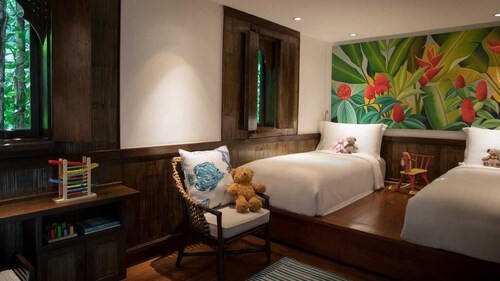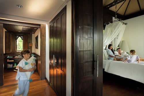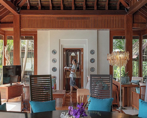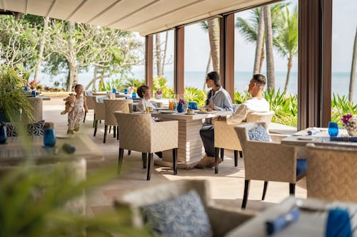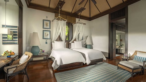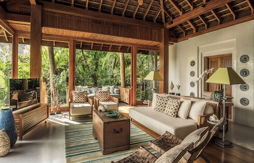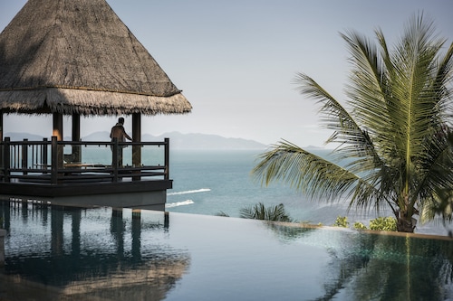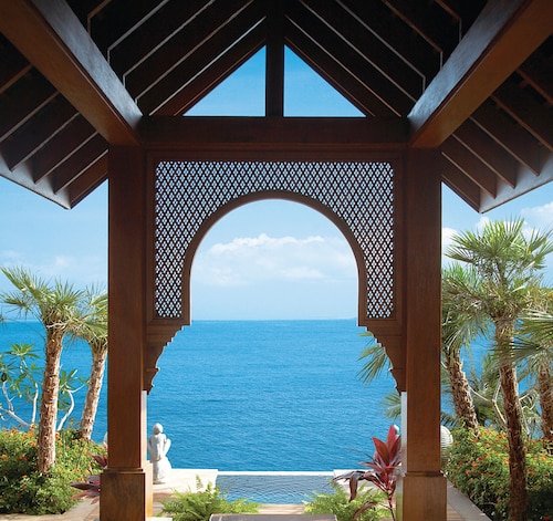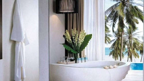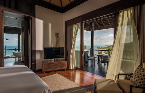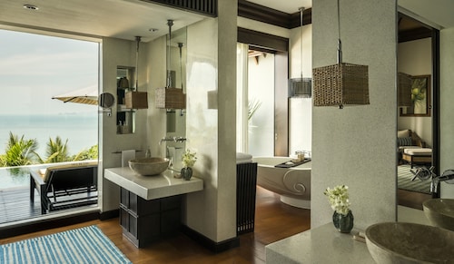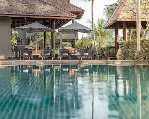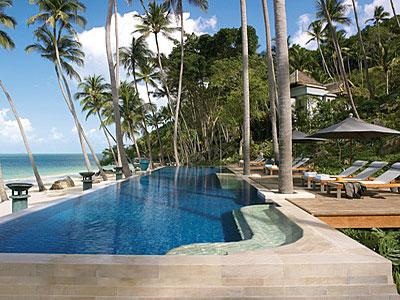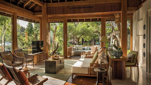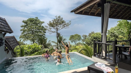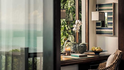 フォーシーズンズ コ サムイは、サムイ島の北西の角、レムヤイ岬の突端に建てられた、ラグジュアリーリゾート。小さなプライベートビーチを囲む斜面にヴィラタイプのお部屋が間隔をおいて建てられています。車留めの設置された大きな扉を通って、リゾート内に一歩足を踏み入れた瞬間、驚かされるのは、そのエントランスロビー。青い空とエメラルドグリーンの海、そして隣の島パンガン島を望む絶景をバックに、まるで空中に浮いているかのような、デッキスペースに2つのチェックインテーブルが配置されています。他のフォーシーズン系のリゾートがそうであるように、リゾートの中からは、リゾートの外の人工物は目に入らないように設計されていて、外の世界の喧騒から完全に切り離された、ホリデータイムを満喫することができます。客室は、全てのお部屋がプライベートプールを備えたヴィラタイプ。一番リーズナブルな1ベッドルームヴィラでも103 ㎥の広さ。ファミリーで利用できるファミリービラや、ハネムーナーに人気のビーチフロントヴィラなど、全6カテゴリーが用意され、どのお部屋からも、美しいシービューが楽しめます。飲食施設も充実していて、昼間はビーチサイドレストラン「P