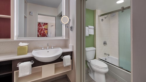 洗面台とバスルームは別になっていて、バスタブも大人がゆったり入れるサイズです。シャワーカーテンも楽器や音符のミュージック柄になっています。