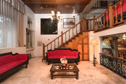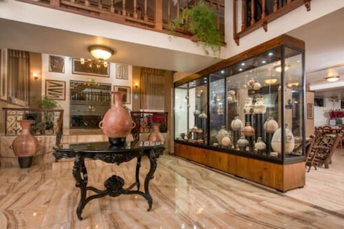 小規模なホテルで落ち着いた内装と真ん中の吹き抜けのロビーが特徴的で、吹抜けを眺められる階段が面白い。