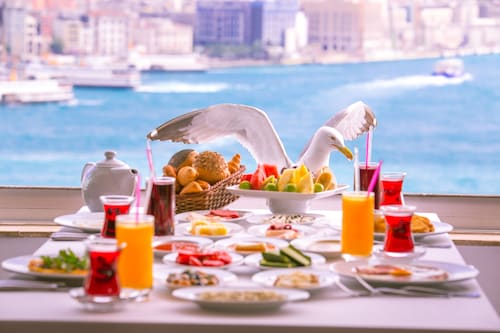 朝食のレストランからは目の前にボスポラス海峡、金角湾、市街の景色が広がり、朝から美しい景色を見て、素敵な一日になること間違いなし!