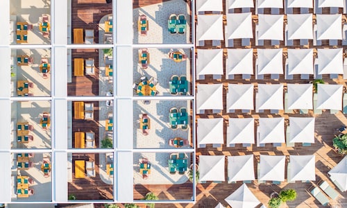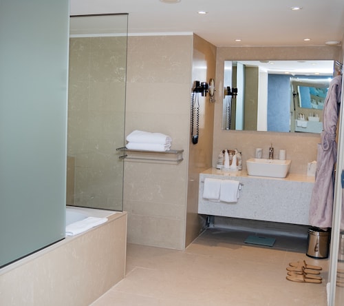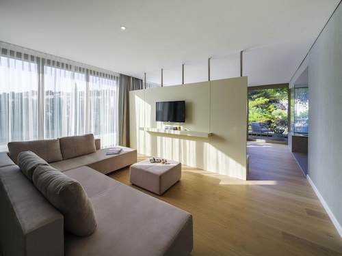 客室の窓を開ければ目の前はアドリア海のパノラマ景色。ドゥブロヴニク旧市街は見えませんが、アドリア海に昇る日の出に刻々と変化する海と空や、星を散りばめたような夜景は贅沢そのもの。ゆったりバルコニーのビーチチェアに寝そべって、一日中まったり海辺のリゾート気分に浸れます。客室の内装は白を基調としたシンプルなデザイナーズホテル風で、浴室はガラス張りですが入浴時にはブラインドで隠すことができます。