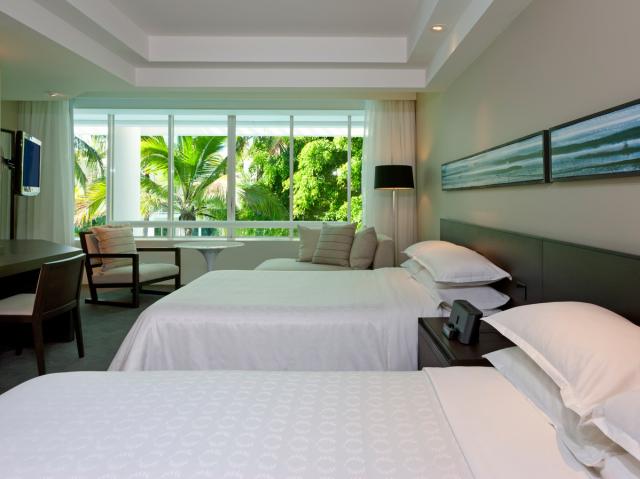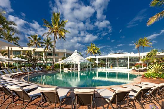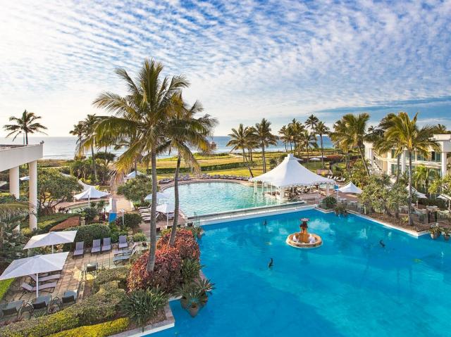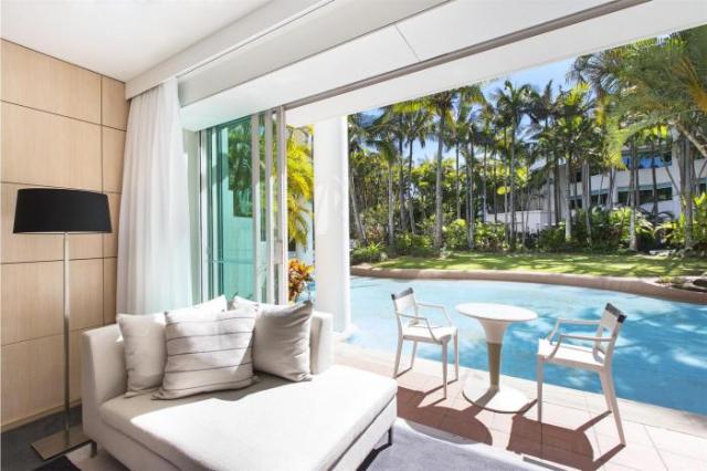 サーファーズパラダイス中心部から車で約10分ほどのメインビーチエリアにあります。ビーチに面した広い敷地に、ラグーンプールとトロピカルガーデンを配した低層階のリゾートホテル。ロビーは高い天井とガラス張りのつくりが開放的でとても広くみえます。室内ラグーンから流れ落ちる滝があり、その向こうにはゆれる椰子の木と太平洋が見え、なんともいえないリゾート感に溢れています。新しいとはいえませんがお部屋もゆったりとして快適です。中心地からすこし離れているので、静かに滞在を満喫したい人におすすめ。美しいラグーンプールでのんびりしたり、直接ビーチに出ることもできるので、ビーチ沿いを散策したりを楽しめます。隣にはテニスコート、ラッププール、ジムなどのスポーツ設備とラグジュアリーなスパ体験ができるゴールデンドアデイスパ&ヘルスクラブが隣接。エクササイズやテニスをした後に、デイスパで癒されるのもいいですね。またここは、道を挟んでヨットやクルーザーのマリーナがあるロケーションで、高級ショッピングコンプレックスとして知られるマリーナミラージュへは橋を渡っていくことができます。マリーナミラージュには、カフェ、レストラン、ブランドショップな