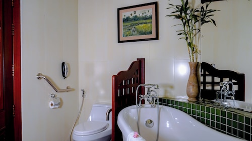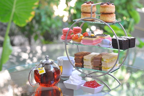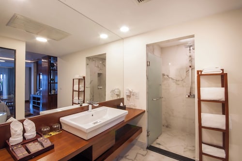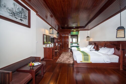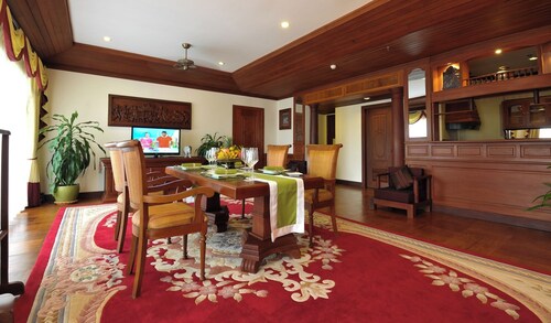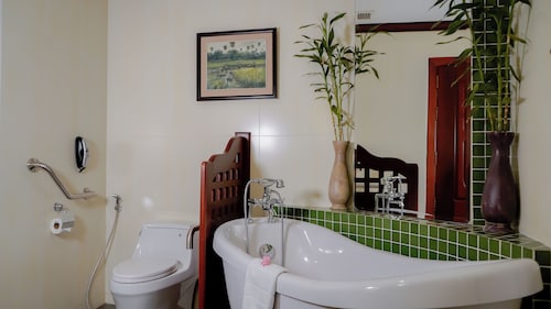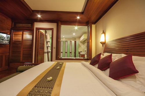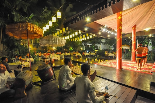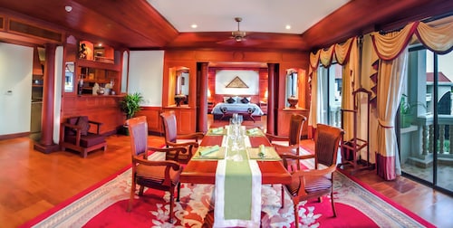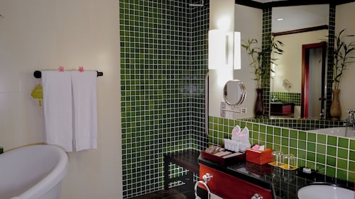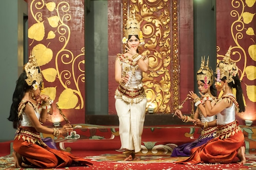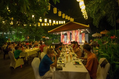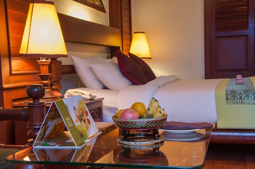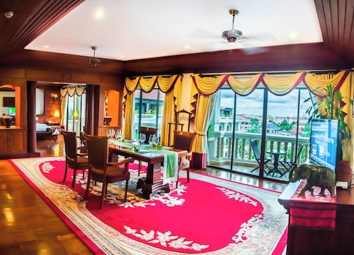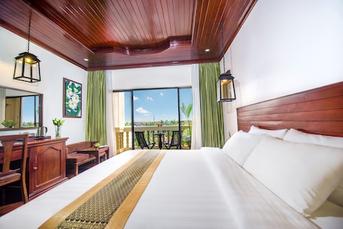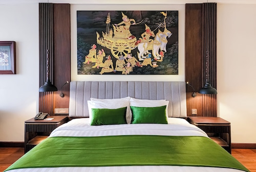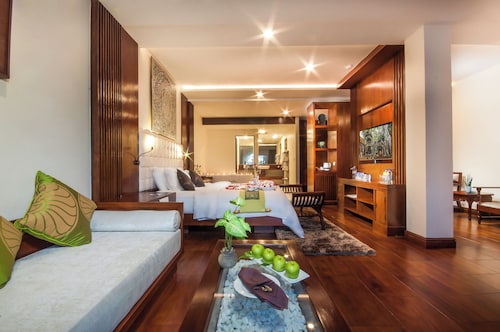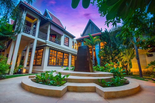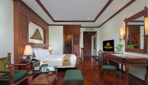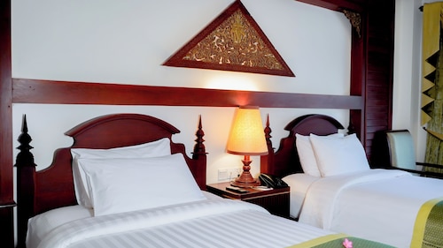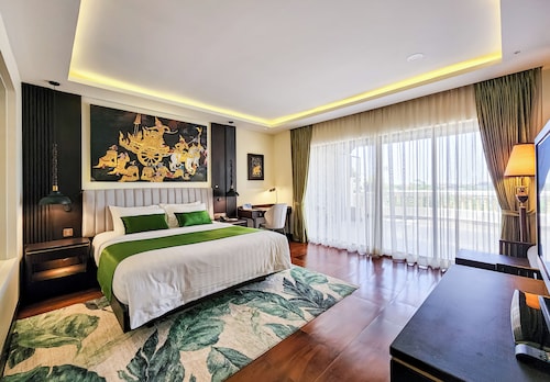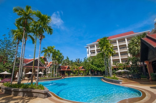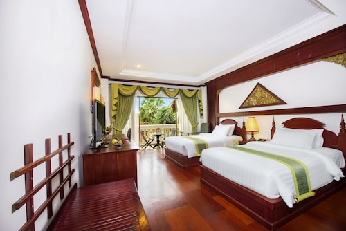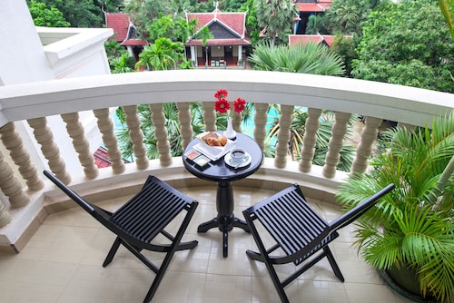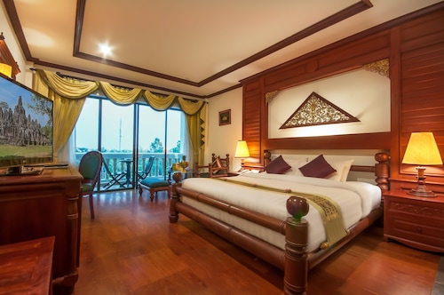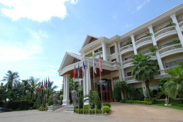 カンボジア人オーナーの大型リゾートホテル。ホテルのテーマカラーは緑で統一され、ウエルカムドリンクにはカンボジアの伝統的なクメール菓子がいっしょに出されます。庭園は自然に溢れ、スパ、ジム、美容室などの設備が充実しておりホテル内でのんびり過ごすことが出来ます。特にホテル内にあるムティタスパでは、カンボジアの伝統療法である「チュポン(スチームサウナ)」が受けられる事で有名です。また4階にあるダムナックラウンジでは、シェムリアップの町並みが一望できるデッキがあり、サンセットも楽しめるのがポイント。シェムリアップ国際空港から車で約30分、国道6号線東側に位置しています。徒歩圏内には、プサールー(ローカル市場)があり、遺跡へのアクセスは良いですが、市街地までは遠く、ホテル前は昼夜問わず交通量が多いため徒歩での移動は危険です。移動は車またはトゥクトゥク(三輪バイク)での移動をお勧めします。客室は、デラックス、ランドマーク、ボレイスイート、ロイヤルスイート、4つのカテゴリーがあり、室内は木をふんだんに使った家具で、落ち着きのある空間になっています。デラックスルームの広さは40平方メートルあり、エアコン完備、テレビはもちろ