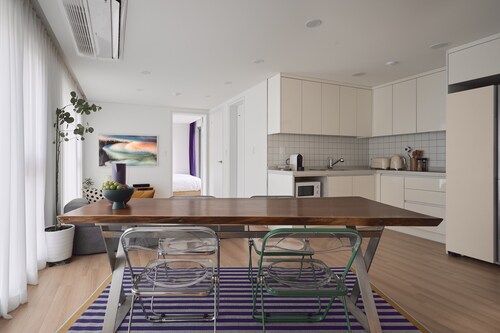 チョンノ区に位置するこのアパートメントは、トンデムン セオングワ公園および東大門市場から徒歩 15 分圏内です。明洞通りおよび東大門歴史文化公園も 5 km 圏内です。地下鉄 昌信駅まで徒歩 11 分、地下鉄 東大門駅まで徒歩 13 分です。 ルーフトップテラスのほか、この禁煙のアパートメントにはランドリー設備および庭園があります。セルフパーキング は無料です。 アパートメントには、ベッドルーム 3 室、WiFi (無料)、セレクト コンフォート ベッドが備わっています。床暖房 (バスルーム)をご利用いただけるほか、洗濯機 / 乾燥機、バルコニー、薄型テレビもあります。