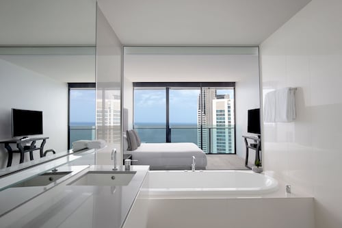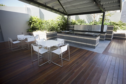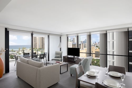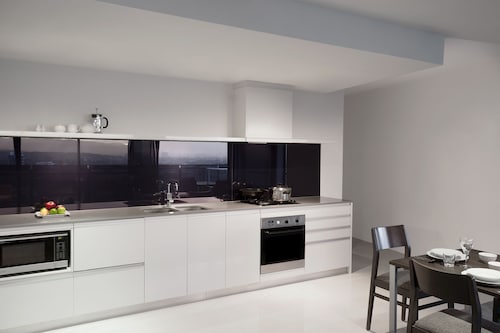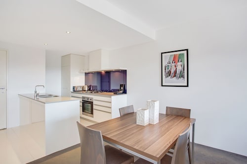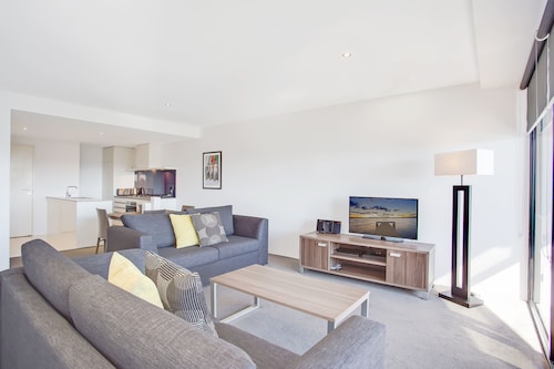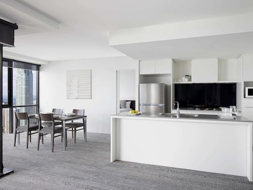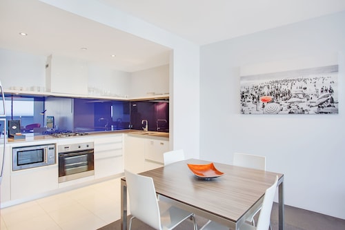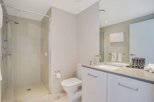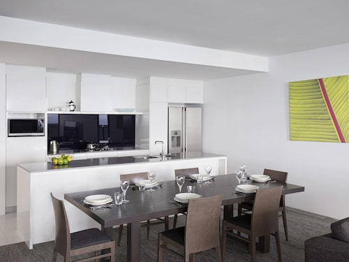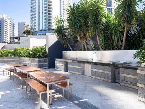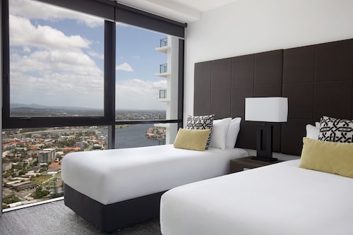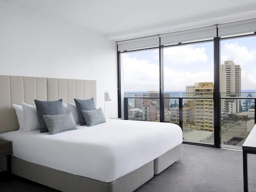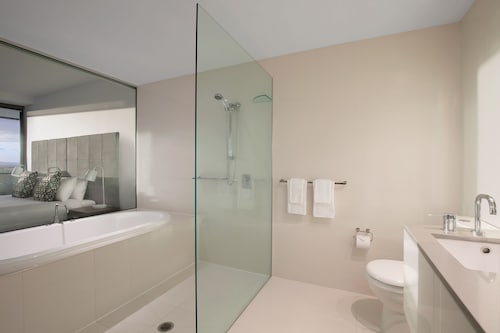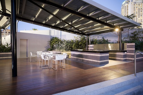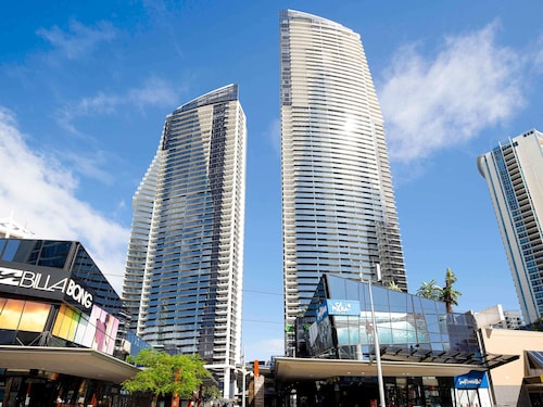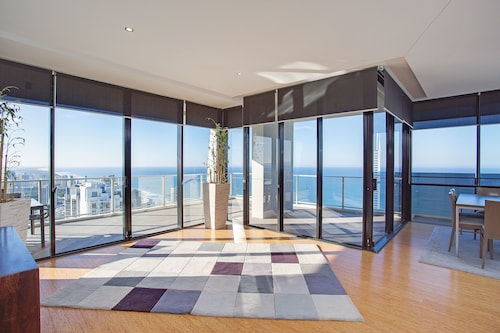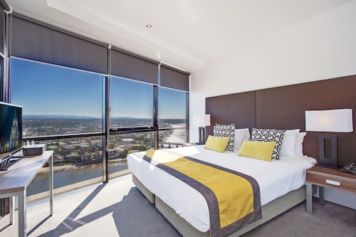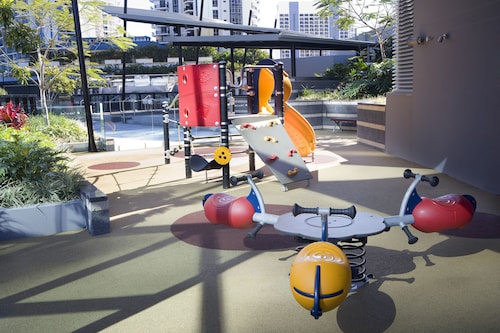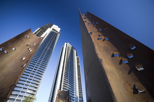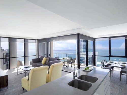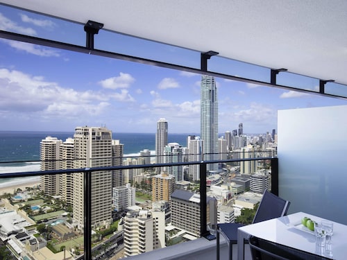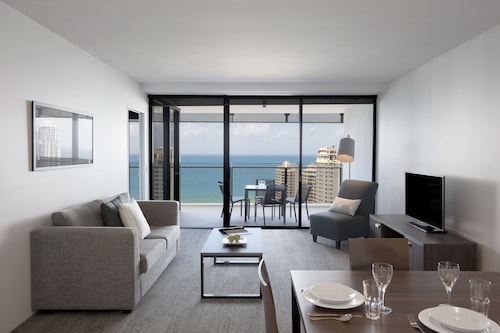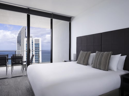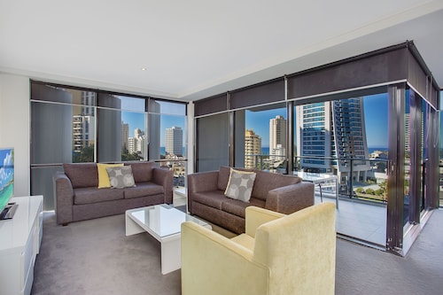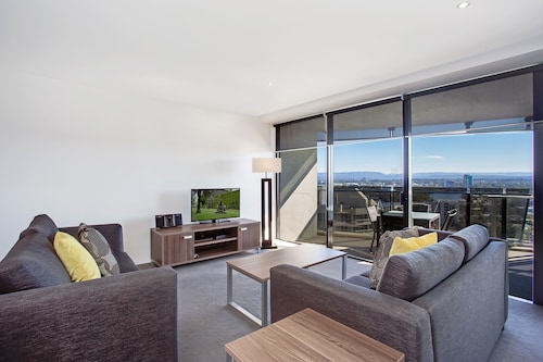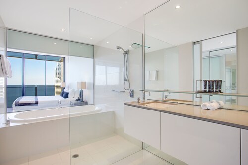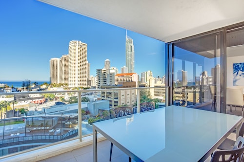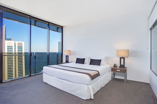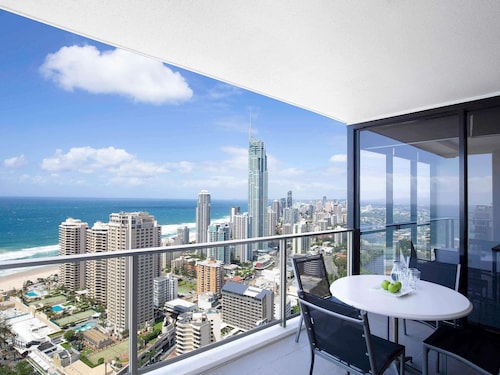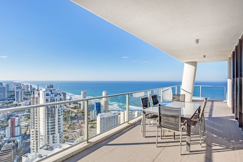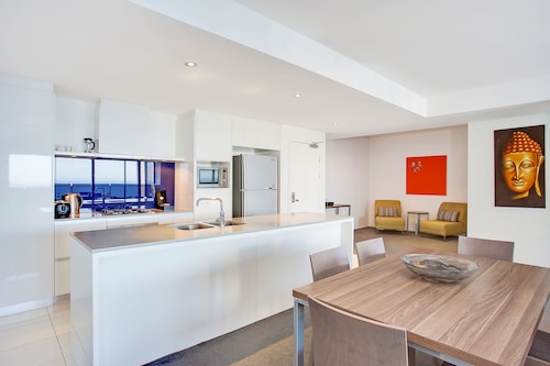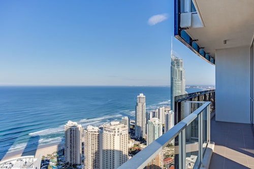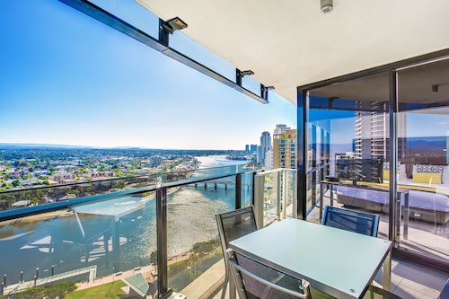 サーファーズパラダイスの中心地、サークル オン カヴィル ショッピングセンターの上にあります。1ベッドルームから3ベッドルームまであり、基本は2泊から。 住んでいる人もいるホリデーアパートメントですが、フロントも24時間利用できます。なんといっても街の真ん中の立地と、ショッピングセンターにスーパーマーケットがあるのが便利!どこでも歩いていけてカビルモールは徒歩3分、トラムのカビルアベニュー駅は2分、裏にはバス停もあります。お部屋はかなり広々としていてバルコニーもかなり広め。ここで4人で朝食をとっても余裕なくらいで、家族やグループで利用するのもおすすめです。内装はシンプルモダンなインテリア、まだ新しいので清潔感もあります。そしてここは、床から天井から前面ガラス張りになっていて眺めが満喫できます。もちろん海側ビューもいいですし、山側ビューもステキです。街をぬうようにひろがる運河やネラング川、住宅地の裏庭にプールがいっぱいあるのが見えたり、川でボートに乗る人、ヒンターランドの山々、夕日、そして夜はキラキラ輝く夜景が楽しめます。バスルームもガラス張りで、部屋の位置にもよりますがおフロに入りながらの眺めもあります。