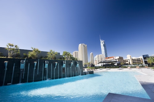 サーファーズパラダイスの中心地、サークル オン カヴィル ショッピングセンターの上にあります。 1ベッドルームから3ベッドルームまであり、基本は2泊から。 住んでいる人もいるホリデーアパートメントですが、フロントも24時間利用できます。 なんといっても街の真ん中の立地と、ショッピングセンターにスーパーマーケットがあるのが便利! どこでも歩いていけてカビルモールは徒歩3分、トラムのカビルアベニュー駅は2分、裏にはバス停もあります。 お部屋はかなり広々としていてバルコニーもかなり広め。 ここで4人で朝食をとっても余裕なくらいで、家族やグループで利用するのもおすすめです。 内装はシンプルモダンなインテリア、まだ新しいので清潔感もあります。 そしてここは、床から天井から前面ガラス張りになっていて眺めが満喫できます。 もちろん海側ビューもいいですし、山側ビューもステキです。 街をぬうようにひろがる運河やネラング川、住宅地の裏庭にプールがいっぱいあるのが見えたり、 川でボートに乗る人、ヒンターランドの山々、夕日、そして夜はキラキラ輝く夜景が楽しめます。 バスルームもガラス張りで、部屋の位置にもよりますがおフロに入りながらの眺めもあります。 ホリデーアパートメントなので、ベッドメーキングやお掃除はあまり期待せず、 セカンドベッドルームのシングルベッドがちょっと小さいです。 交通量が多い通りに面していますがドアを閉めれば大丈夫。 建物がサウスタワーとノースタワーの2棟に分かれていて、フロントはサウスタワーにあります。 プールはそれぞれのタワーの4Fにあり、両方利用できます。 サウスの方はスパ付き、プールはノース方がキレイですので両方せひ見てみてください。