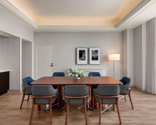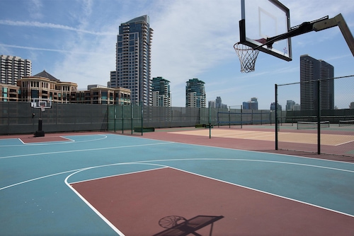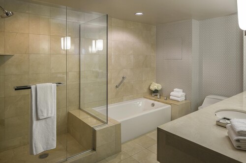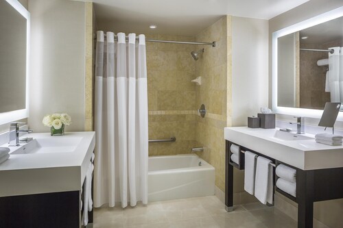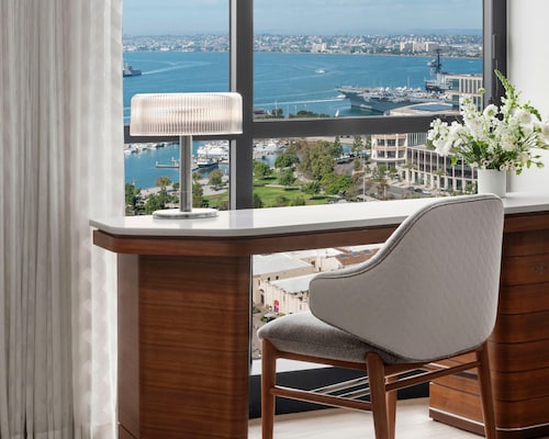 シーポートビレッジまで徒歩3秒という好立地!コンベンションセンターまでも徒歩5分で道路の向かい側(Harbor Drive)を約15分歩けばガスランプクウォーター!ダウンタウンのどこにいても高層ホテルでツインタワーなので一際目立つホテル。ロビーは大理石の床で壁には大きな絵画が飾ってあり、天井が高くゴージャスな作りです。照明の色はオレンジでホテル全体の雰囲気は落ち着いています。フロント係りも丁寧に分かりやすく施設の説明をしてくれます。プールはもちろんバスケットコート、テニスコート、ビリヤード台、サウナ、スパとレクリエーションも充実!客室はロビーとは違った雰囲気で、黒と白を基調とし、スッキリしています。お部屋には大きな窓があり、サンディエゴベイやダウンタウンの景色が一望できます。バスルームには照明つきドレッサーもついており、女性はとってもお化粧しやすいです!また、バスタブがついているのも嬉しいですね。バスルームアメニティーはグランドハイアットではお馴染み、世界の高級スパブランド“ジューン・ジェイコブス”。リラックスできること間違いなしです。客室には無料WIFI(アクセスするにはルーム番号と名字が必要)、コーヒ