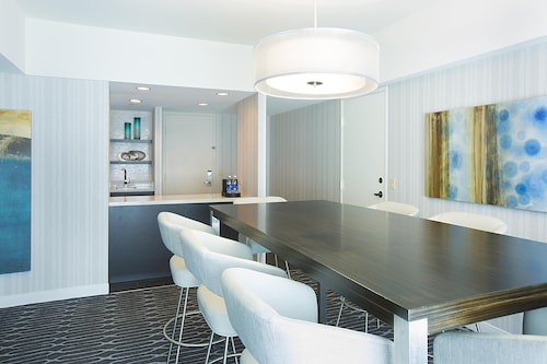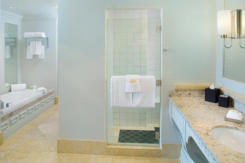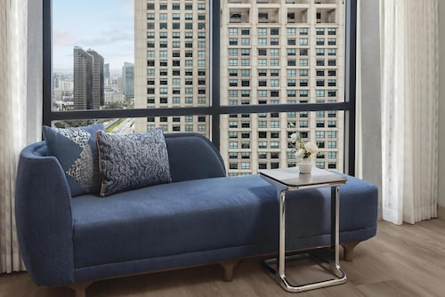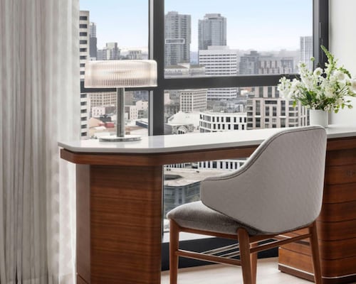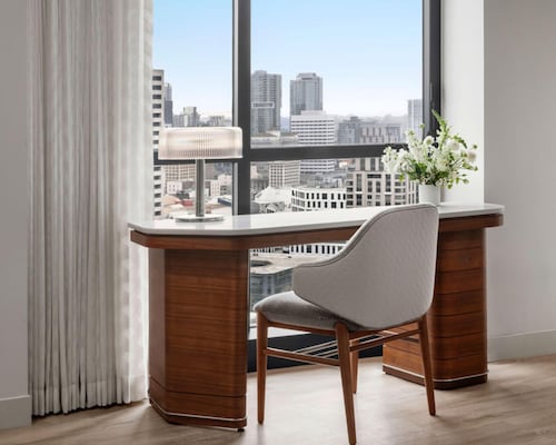 客室はロビーとは違った雰囲気で、黒と白を基調とし、スッキリしています。お部屋には大きな窓があり、サンディエゴベイやダウンタウンの景色が一望できます。バスルームには照明つきドレッサーもついており、女性はとってもお化粧しやすいです!また、バスタブがついているのも嬉しいですね。バスルームアメニティーはグランドハイアットではお馴染み、世界の高級スパブランド“ジューン・ジェイコブス”。リラックスできること間違いなしです。