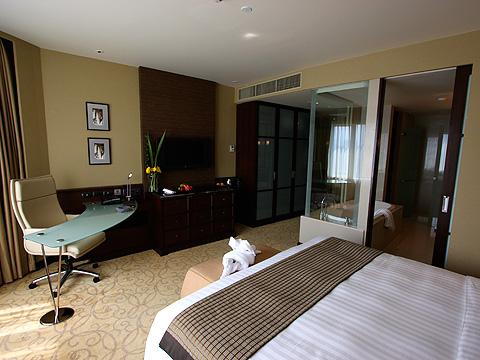 プルマン バンコク グランデ スクンビット(旧:グランドミレニアム・スクンビット)は、スクンビット・ソイ21、BTS「アソーク駅」から徒歩3分の好立地に2008年オープンした、洗練されたデザインのシティホテル。曲線を活かした建築デザインを取り入れた外観もさることながら、レストラン、バー、スパなどの施設もすべてがスタイリッシュでモダンな雰囲気です。屋上にはパッティング グリーンも備え、ゴルファーにも人気。 客室は全325室。立地は高架鉄道BTSと地下鉄MRTが接続する、スクンビット通りとアソーク通りの交差点から徒歩3分。タクシーを利用するにもとても便利な立地で、バンコク市内のどこにでも容易にアクセスできます。徒歩圏内には、2012年にオープンしたターミナル21やロビンソンなどのデパートや、シェラトングランデ、ウェスティンなどの高級ホテルが点在しています。また、歓楽街「ソイ・カウボーイ」へも徒歩でアクセスできます。客室ですが、一番リーズナブルなカテゴリのデラックスルームは、お部屋面積38平米と広く、ブラウンを基調とした、ベージュ系の落ち着いた雰囲気にまとめられています。インターネット接続や画像出力に対応した、