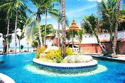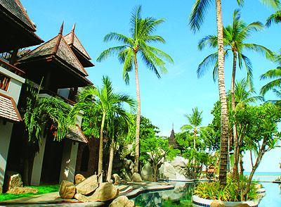 ムアン サムイ スパ リゾートは、サムイ島で最も賑やかなビーチ、チャウエンビーチの中心部にある、ミドルクラスリゾート。ビーチサイドでは、海水浴やマリンスポーツ、ビーチロード側では、お食事やショッピングなど、どこにでも徒歩で気軽に出かけられる便利なロケーションが人気です。ホテルの目の前のビーチは、リーフの内側になっていて、水深が浅く、波の入る11月〜3月も静か。小さなお子様でも安心して水遊びをすることができます。敷地はそれほど大きくありませんが、敷地の両サイドに立つ3階建ての客室棟の真ん中が小川をあしらったガーデンになっていて、たくさんの熱帯植物が植えられ、トロピカルムード満点。小川を流れる水の音が、町中にいることを忘れさせてくれます。客室(グランドデラックス)は、チーク材をふんだんに使った高級感のある内装で、53平米と広く、とてもゆったりした雰囲気。部屋の前には、プライベートバルコニーがついていて、南国の風を感じながら、屋外での時間も楽しむことができます。全てのお部屋にジャグジーバスが付いているのも魅力です。最上階にある、ロイヤルスイートのお部屋は、106平米と、グランドデラックスの倍の広さ。大きな屋外ジ
