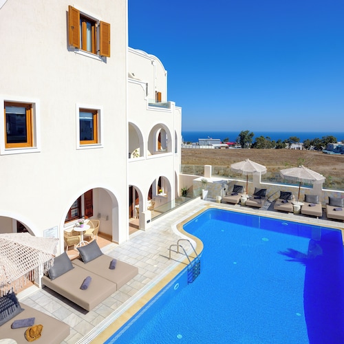 【Wi-Fi一部の公共エリア無料】 サントリーニ島フィラに構える伝統的なキクラデス諸島スタイルのホテルです。 23室ある客室には豊富な設備とアメニティを備えラグジュアリーな雰囲気。いくつかの客室からは火山島の美しい眺めを楽しむことができます。特に夕日が落ちる時間帯は息をのむ美しさ。 ホテルはスイミングプール、バーなどの施設を設けており、ツアーサーヴィス、レンタカーサービスなども扱っています。