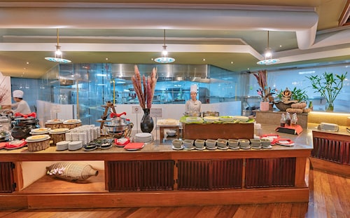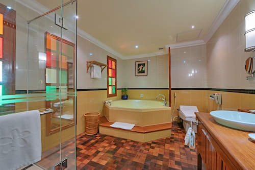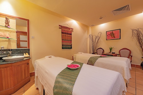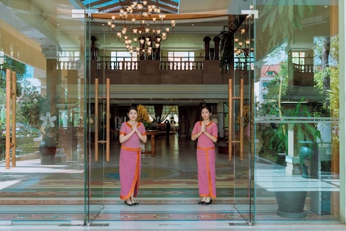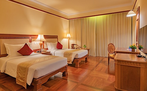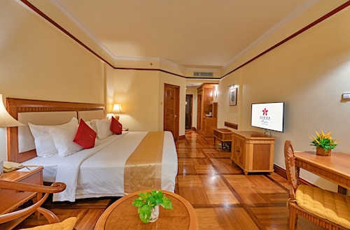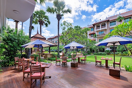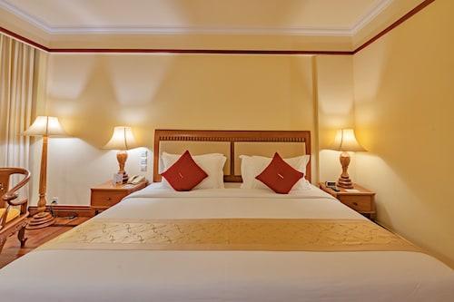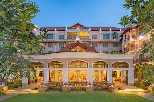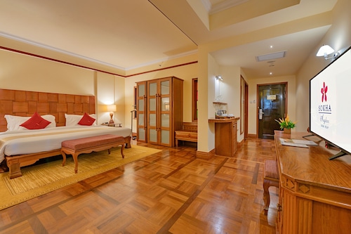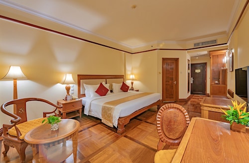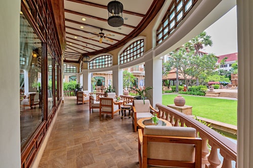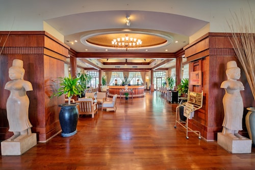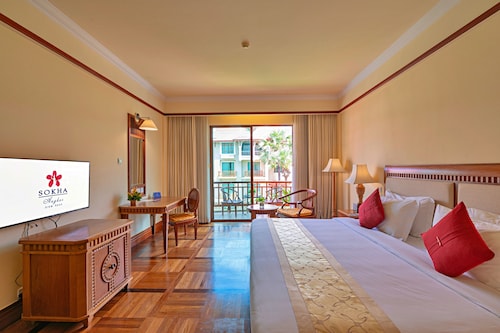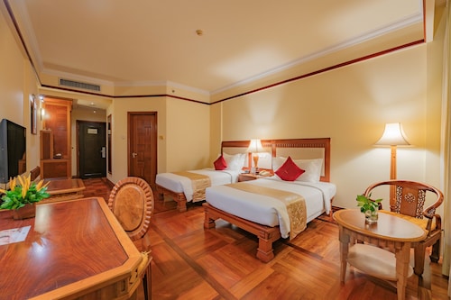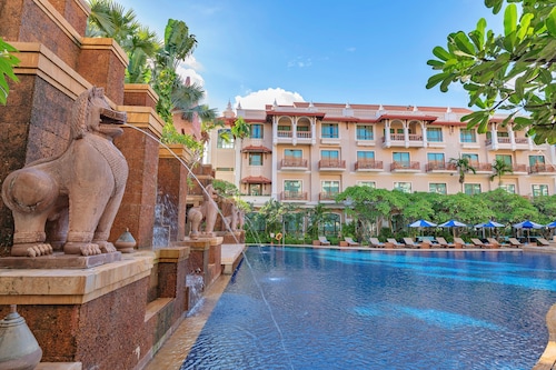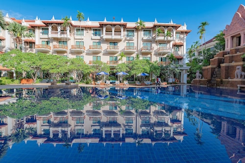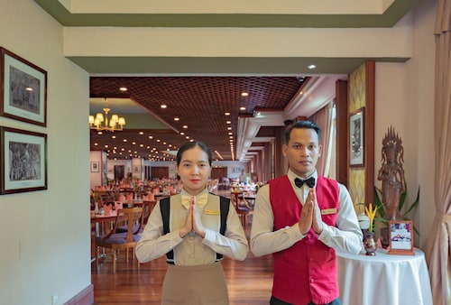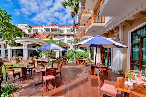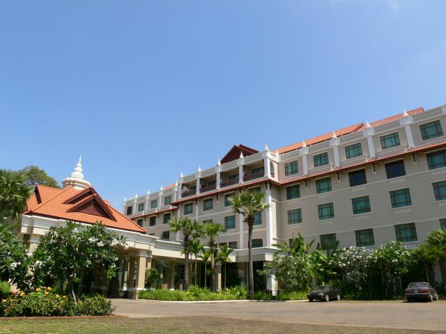 カンボジアで一番力を持つ、ソカグループが運営するリゾートホテル。ホテル内には、プールやスパ、日本食レストランの他、2013年にオープンしたラウンジなど設備が充実。シェムリアップで唯一、ホテルでアンコールパスを作成することが出来るため、ここに滞在すると時間が効率良く使える。家族連れやカップルはもちろん、ビジネス目的の海外出張の方にもお勧め。市内中心部に位置し、ホテルの近くにはコンビニや大型ショッピングモールもあり便利。昼間ショッピングするのに人気のオールドマーケットや夜のお土産物の買い物スポットであるナイトマーケットまでは片道約1km、徒歩にすると10~15分。タクシーなどを使うと5分ほどで到着する。広々とした客室は比較的新しくシンプルながらも清潔感があり快適に過ごせる。道路に面しているシティービューよりも、バルコニーから中庭を見渡すことが出来るプールビューの方が雰囲気が良くお勧め。一部の客室はWi-Fiのつながりが悪い場合がある。バスルームは、バスタブ完備で、シャワーが固定式で無いのもポイントが高い。全体的に広々としており綺麗。アメニティー(シャンプー、コンディショナー、石鹸、歯ブラシなど)も十分揃ってい