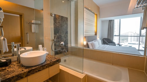 部屋は値段相応でシンプルでスタイリッシュな内装です。バスタブ付きの部屋もありますので、もしシャワーのみの部屋になったらスタッフに言えば変更してくれます。窓からの眺めは街並みとまわりの緑で、残念ながら海は遠くて見えません。