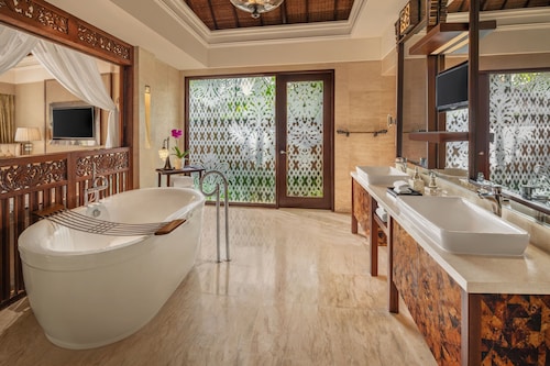 優雅で贅沢なバリリゾートを満喫したい!という方におすすめなのがここ、セントレジスです。豪華でありながら明るく開放的で、ロビーに足を踏み入れた時から洗練された空間が広がっています。客室はスウィートルームとヴィラのみで構成され、全室24時間バトラーサービスがついて最高のサービスが受けられます。日本人のゲストリレーションと日本語を話すスタッフもいて安心です。ビルディングにあるスウィートルーム(ベッドルームとリビングが別にあります)はスタンダードな部屋でも90平方メートル以上のゆったりした広さで、ツインベッドも選べます。薄型テレビやDVDプレイヤー、BOSE製のサウンドシステム、快適なWIFI環境、もちろんバスタブも完備。バス・アメニティにはドクターコスメ系の高級ブランドでホテル内にスパも併設している「ルメードゥ」のシリーズが用意されています。香りも使用感も爽やか。お部屋での快適さも間違いありません。ですが、セントレジスでおすすめしたいのはやっぱりヴィラ!重厚で天井が高く優雅なバリの隠れ家という雰囲気。370平方メートル以上とさらにゆったり広々とした作りでバスルームも豪華。庭には専用プールとバリ式のガゼボもあり、