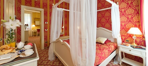 大運河の河岸沿いに建つ4つ星スーペリアホテル。水上バスの停留所のすぐ前にある分かりやすい立地で、サンマルコ広場へも近く観光にも便利。 お部屋カテゴリーは、ジュニア・スイート・デラックス、ジュニア・スイート、スーペリア、スタンダードの4種類。いずれもベネチアンスタイルのインテリアです。運河の見える部屋があるのは、ジュニア・スイート・デラックスとジュニア・スイートです。 小さな運河に面したホテルの場合、「運河の見える部屋」といっても眺望がいまひとつの場合も。その点、このホテルは大運河沿いにあるので、運河の見える部屋なら、素晴らしい大運河の眺望が堪能できます。 スーペリアのカテゴリーでは運河の見える部屋はありませんが、天蓋付のベッドのお部屋もあります。スタンダードのお部屋は、ホテルの建物の横側や裏にあり、いくつかの部屋からはサン・ザッカリア教会が見えます。 館内のレストラン「プリンチペッサPrincipessa」は、宿泊客は割引料金で利用でき、外のテラス席では運河を眺めながらのお食事が楽しめます。 ★客室設備(全カテゴリー共通): 無料WiFi、衛星放送付TV、ミニバー、冷暖房、セーフティーボックス、大理石のバ