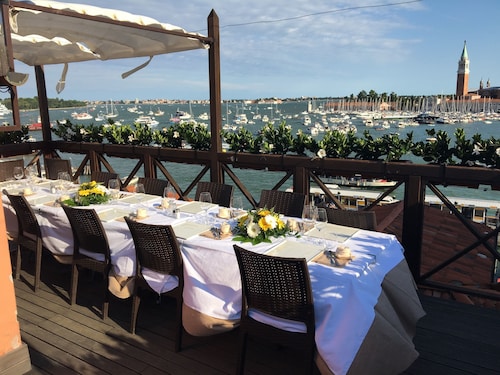 館内のレストラン「プリンチペッサPrincipessa」は、宿泊客は割引料金で利用でき、外のテラス席では運河を眺めながらのお食事が楽しめます。