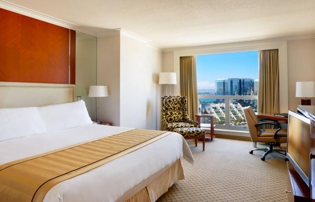 ガスランプクウォーターにある清潔感溢れるホテルです。なんと言っても、ペトコパークが目の前なので球場に行かなくても雰囲気が味わえます。ガスランプクウォーターは夜でも賑わっているので散策なんてのも楽しいですね。22階にはサンディエゴで“No.1ルーフトップバー”に選ばれたALTITUDE Sky Loungeがあり、コロナド島やサンディエゴダウンタウンが一望できるロマンティックなスポットでもあります!平日の4時~7時はハッピーアワーで通常価格より安い料金で提供され、また日曜日は一日中ハッピーアワーと嬉しいサービス。金曜と土曜日はDJが来て少し賑やかになります。もちろんここからの野球観戦も可能!ロビーはウッド調で、カラフルな魚の置物や花瓶が棚にたくさん置いてあり、フロントデスクや壁をグリーンやブルーのライトで照らす華やかな演出があります。直接ホテルのwebサイトから申し込みをすると無料Wi-Fiの特典があり、ホテル代も現地払いが可能です!通常、Wi-Fiは1日あたり約$10です。客室は白やベージュと柔らかい色使いで明るく、ふんわりした雰囲気。また、フラットTV、CDプレイヤーとスターバックスコーヒーが付いていま