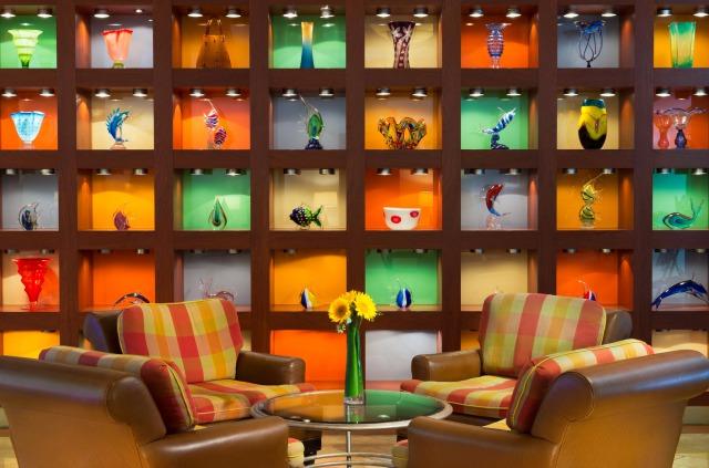 ロビーはウッド調で、カラフルな魚の置物や花瓶が棚にたくさん置いてあり、フロントデスクや壁をグリーンやブルーのライトで照らす華やかな演出があります。直接ホテルのwebサイトから申し込みをすると無料Wi-Fiの特典があり、ホテル代も現地払いが可能です!通常、Wi-Fiは1日あたり約$10です。