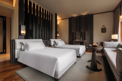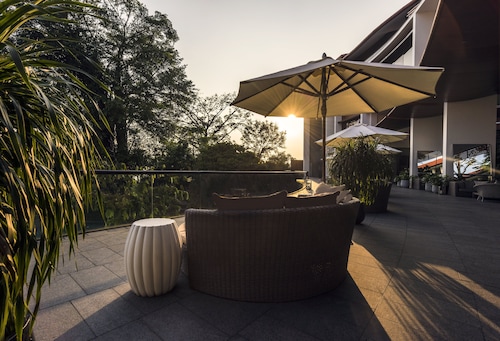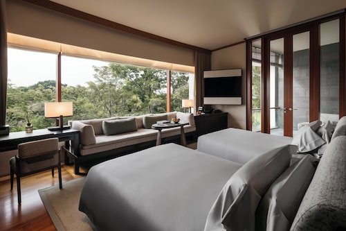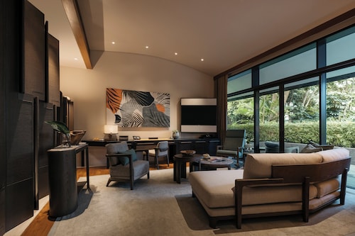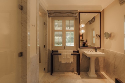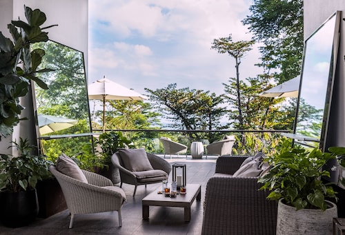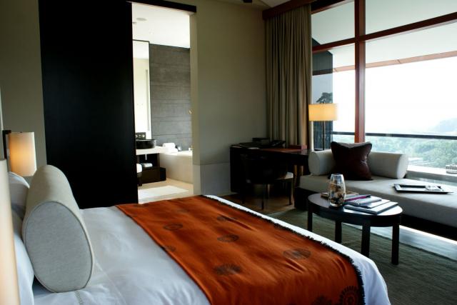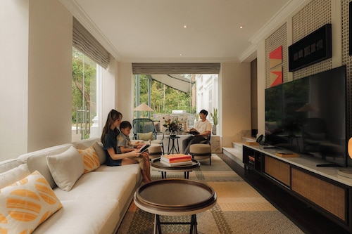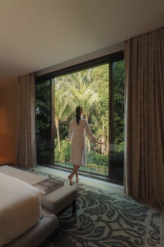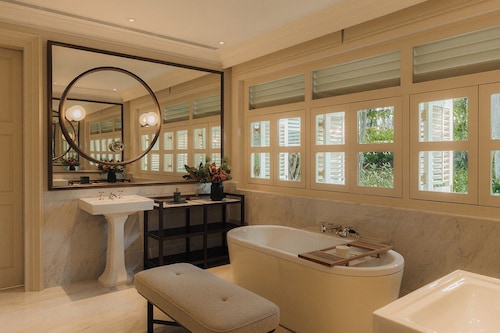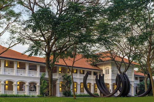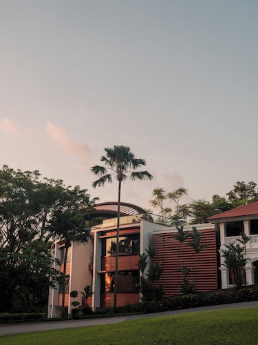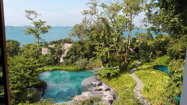シンガポールに数多くあるホテルの中で、ここはズバリ「一目惚れしたホテル」です。ノスタルジックな白亜の外観のロビー棟と、スタイリッシュな近代的な外観の客室棟が敷地内で見事に調和されています。特筆すべきは、ここのプール。段々畑のような造りになっていて、ここがシンガポールであることを忘れさせてくれます。インドネシアのバリ島にある自然豊かな観光地・ウブドにいるようなイメージですね。兎に角、見るもの全てが素敵に見えてしまう「カペラマジック」。素敵なホテルです。ホテルはセントーサ島の入り口に比較的近い小高い丘の上にあります。ユニバーサルスタジオもすぐ近くにあります。セントーサ島に泊まる!と決め打ちの場合は全く気にならないロケーションと言えるでしょう。客室は、リゾートらしい明るい感じで、何より清潔感が溢れます。お勧めのお部屋は、PREMIER-SEA VIEW ROOM。大きな窓からダイレクトに海が望めます。窓が大きいので、お部屋も開放感があり、自然の光もふんだんに入ってきますので、心身ともに癒される素敵な空間です。バスルームはバスタブ、シャワーブース別の造りになっています。清潔感が溢れ、大変綺麗です。洗面所にシンクが