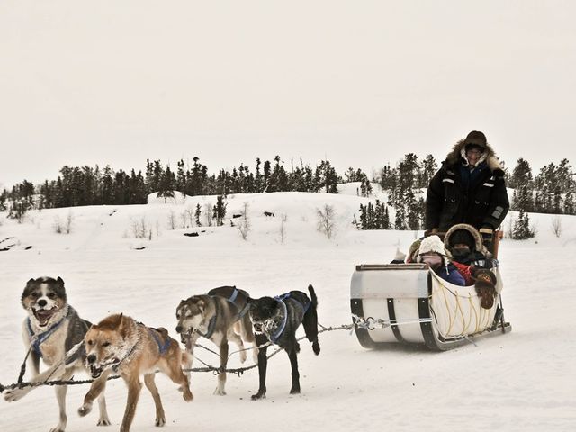 イエローナイフの代表的アクティビティ、犬ぞり体験。犬たちが引くそりに乗って、凍りついたグレース湖のまわりをぐるり一周いたします。操縦はプロにお任せ!ご希望があれば犬たちとの記念撮影も可能です。