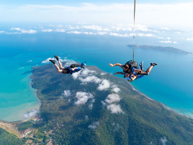エアリービーチ上空からは、グレートバリアリーフやウィットサンデー諸島、ハミルトン島の美しい景色が広がります。上空4,572メートル(15,000フィート)からのダイブ体験は一生の思い出になること間違いありません。