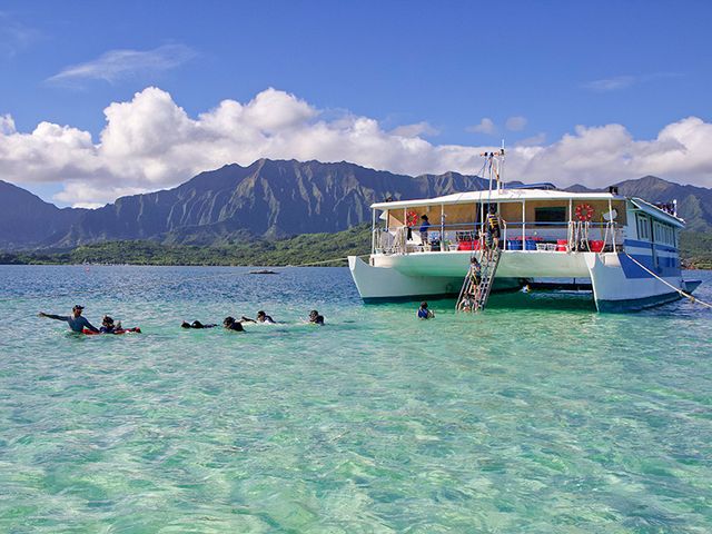 プライベートクルーズで、人気の絶景スポット「サンドバー」へ!開放感のある大型のカタマラン船は揺れが少なく、整った設備の船内ではミュージシャンによるハワイアンミュージックの生演奏も楽しめます。美しいカネオヘ湾でシュノーケリングやカヤック、SUPなどのアクティビティをご体験ください。浮島のラウンジもあるので、泳ぎが苦手な方もゆっくりリラックスしていただけます。ご予約はこちら。
