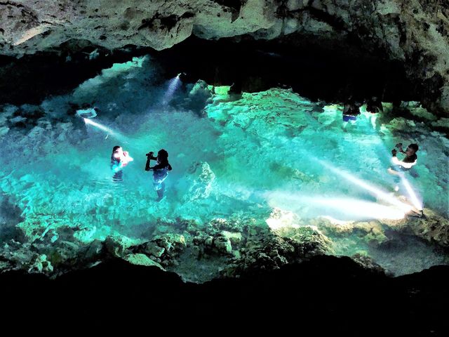 洞窟内では、美しく輝く水の中を泳ぐことも可能!