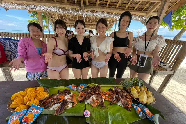 ランチタイムはフィリピンスタイルのBBQ!テーブルいっぱいのBBQや南国フルーツを、青い海を眺めながらみんなでワイワイ楽しむ特別なひとときです。