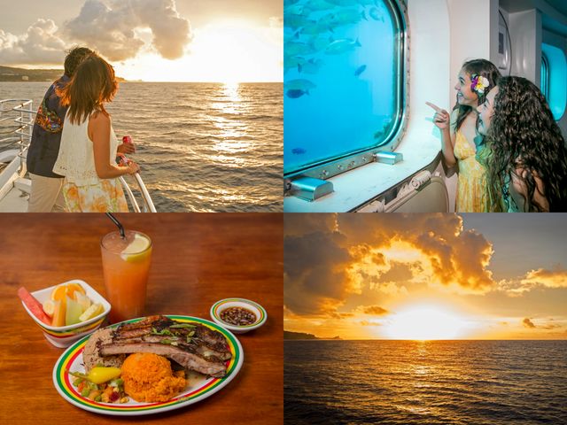 まずはミクロネシア唯一の海中展望塔で、美しい海中世界を堪能!その後アイランドミュージックを聞きながら、夕日が海に沈む景色を船上から眺める贅沢な時間をお過ごしください。クルーズの後は、人気のジャマイカングリルでスペシャルメニューをご用意しています。
