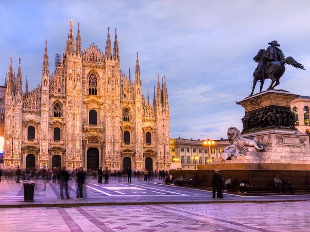 世界最大級のゴシック建築であるミラノのドゥオーモ。約500年もの歳月をかけて完成したこの大聖堂は、全長158m、高さ108mという壮大な規模を誇ります。しかし、驚くべきはその大きさだけではありません。多くの芸術家によって造られた約3500体にも及ぶ緻密な彫刻群や、大聖堂内部の精巧な彫刻、礼拝堂上部を飾る大きなステンドグラスなど、その見どころは尽きることがありません。さらに、屋上テラスからはミラノ市街を一望することができ、階段またはエレベーターにてアクセス可能となっています。