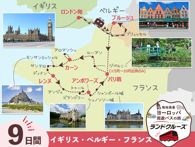 ヨーロッパ周遊ランドクルーズ!ロンドン/タワーブリッジ・セントポール大聖堂、ブリュッセル、ブルージュ/マルクト広場、パリ/エッフェル塔・凱旋門、カーン、モンサンミッシェル、レンヌ、アンボワーズ、シャンボールなどを訪問。1名様から催行、充実した周遊の旅をお楽しみください!