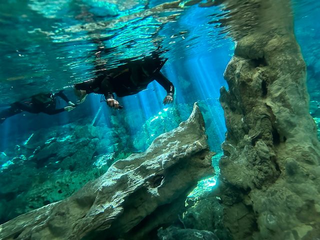 穴場のセノーテ「ドス・オホス」へ、ベテラン日本人インストラクターと行くプライベートツアー。水中ライトを使って洞窟内を探検し、間近で鍾乳石を見ることができます。さらに人気の「グランセノーテ」やトゥルム遺跡、プラヤデルカルメン観光が合わせて楽しめるプランも!