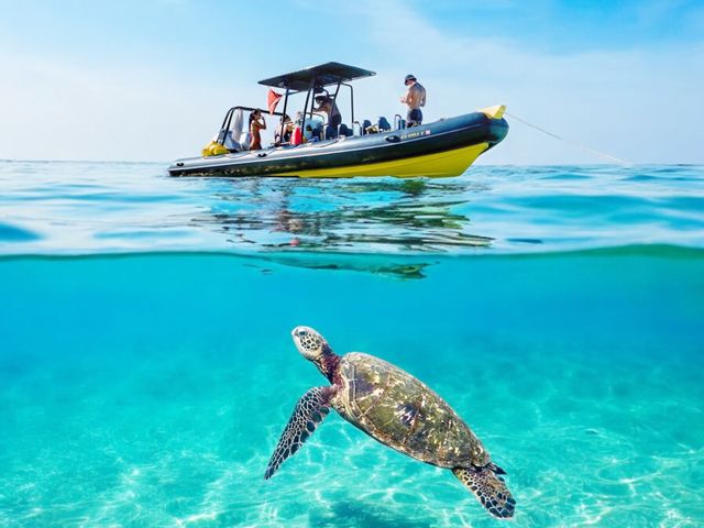 ハワイの人気スポット・タートルキャニオンで、ウミガメが生息する自然豊かな海を楽しむシュノーケリングツアーです。高速ゾディアックボートで移動も爽快!最大6名までの少人数制だから、のびのびとリラックスして海中散策ができます♪ご予約はこちら。