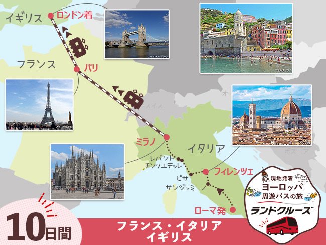 ヨーロッパ周遊ランドクルーズ!ローマ/コロッセオ、フィレンツェ、ミラノ、パリ/エッフェル塔・凱旋門、ロンドン/タワーブリッジ・セントポール大聖堂などを訪問。1名様から催行、充実した周遊の旅をお楽しみください!