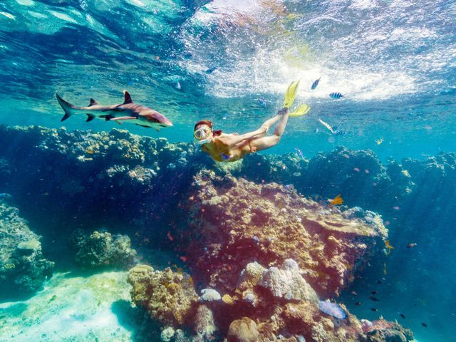 南太平洋の美しい海でリーフシャークと泳ぐシュノーケリングツアー!ベアフット クアタ アイランドリゾートではサメとの出会いだけでなく、美しいビーチやターコイズブルーの海を楽しめます。ビュッフェランチやカヤック&パドルボードなどのアクティビティも含まれた嬉しいプランです!