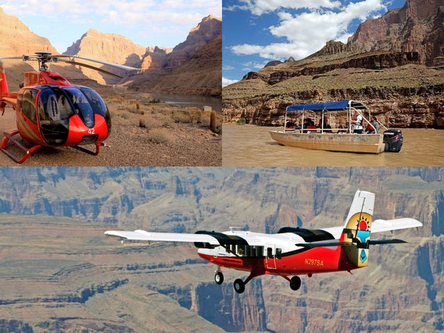小型飛行機、ヘリコプター、ボートを乗り換えながらグランドキャニオン・ウエストリム探検へ。上空やコロラド川からアメリカの広大な景色を満喫できます。高さ1,200mのガラス製の橋「スカイウォーク」も体験可能。ラスベガスのストリップ大通り主要ホテルからの送迎付きで移動も安心です。
