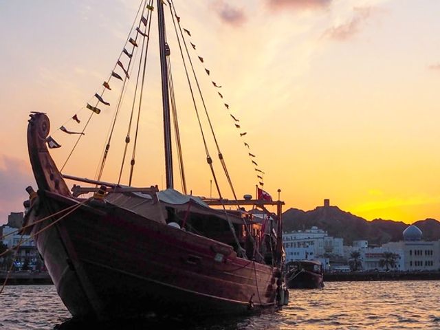 伝統的なダウ船に乗って、マスカット市内を海沿いから満喫!国王所有の高級ホテル、アル・ブスタン ・パレス・ホテルを写真に収めたり、コーヒーやデーツを片手に、美しい景色をご覧ください。