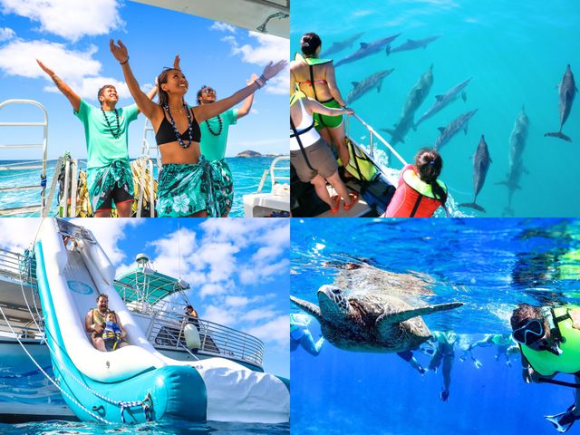 ハワイのベストオプショナルツアーにも選ばれた満足度の高いツアー!紺碧の海が広がる西オアフで野生のイルカ探しとシュノーケリングをお楽しみいただけます。さらにジャンボスライダーやSUP、シーカヤックなど人気マリンアクティビティも充実!安全な航海を祈るセレモニーに始まり、船上ではクルーたちのフラダンスなどハワイの自然や文化へのリスペクトを大いに感じられるドルフィンクルーズです。嬉しいランチ付き!ご予約はこちら。